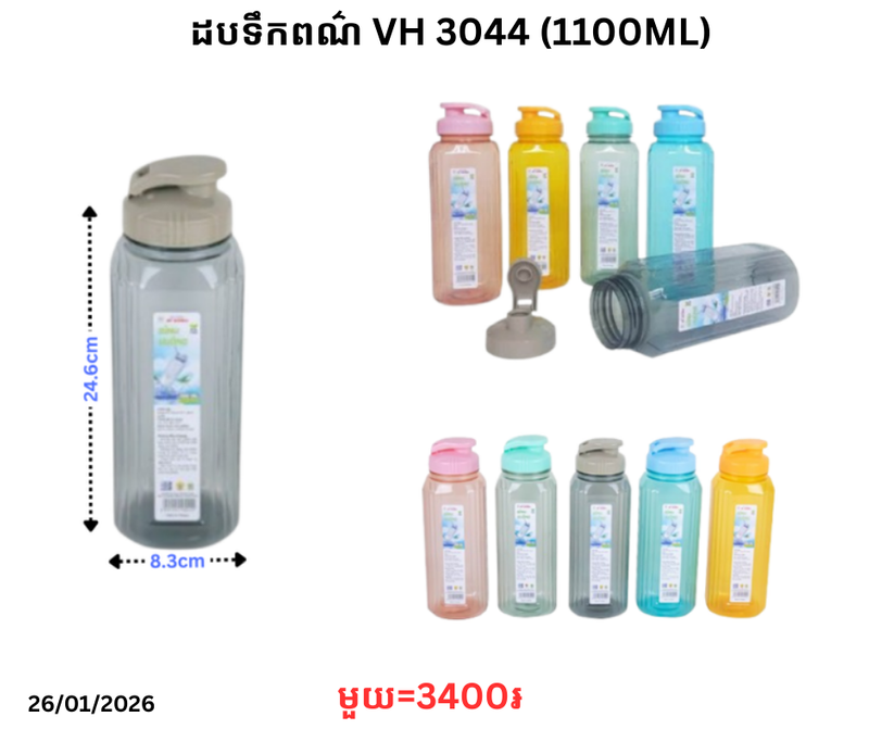 ដបទឹកពណ៌ VH 3044 (1100ML) January 5, 2026 Posted in 3400, VH, ដបទឹក, ដបទឹកជ័រ, ដបទឹកពណ៌, ដបទឹកពណ៌ VH, ទំនិញថ្មី Barcode : 8935124530442